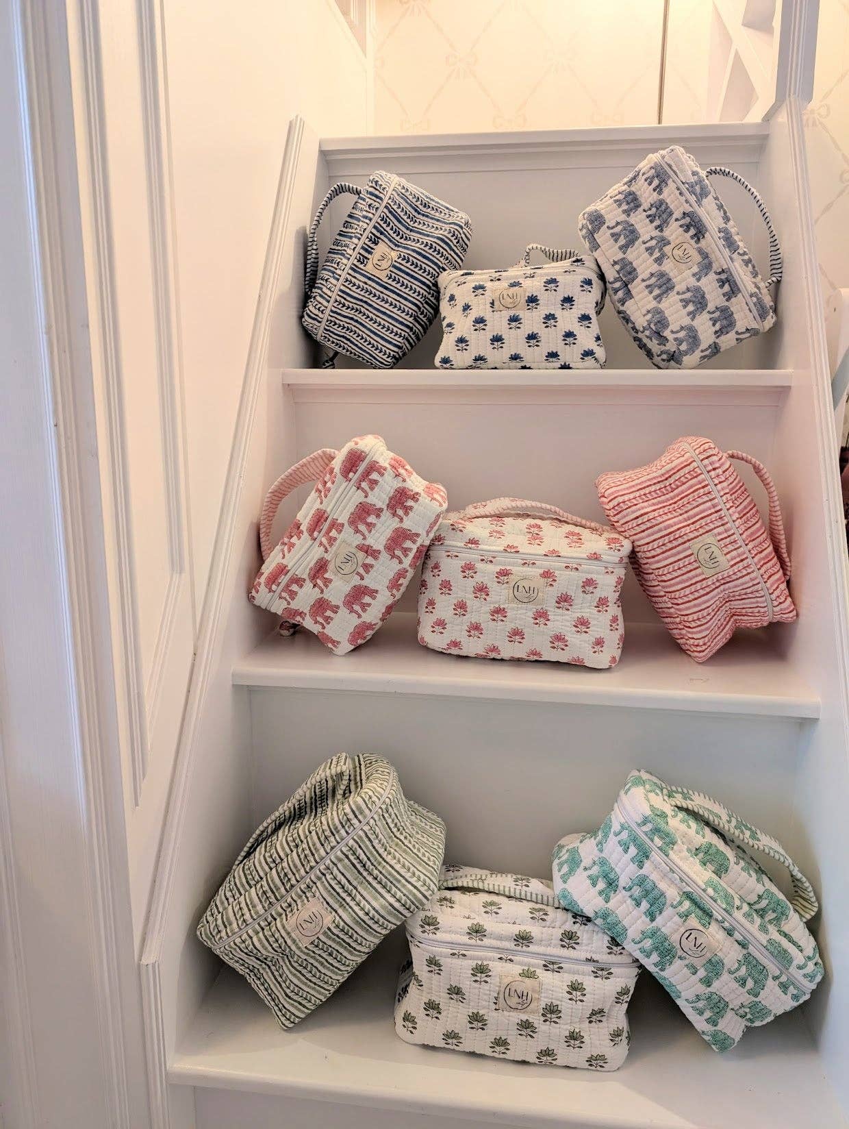 Large Super soft quilted block printed cosmetic bag. Waterproof inner lining.