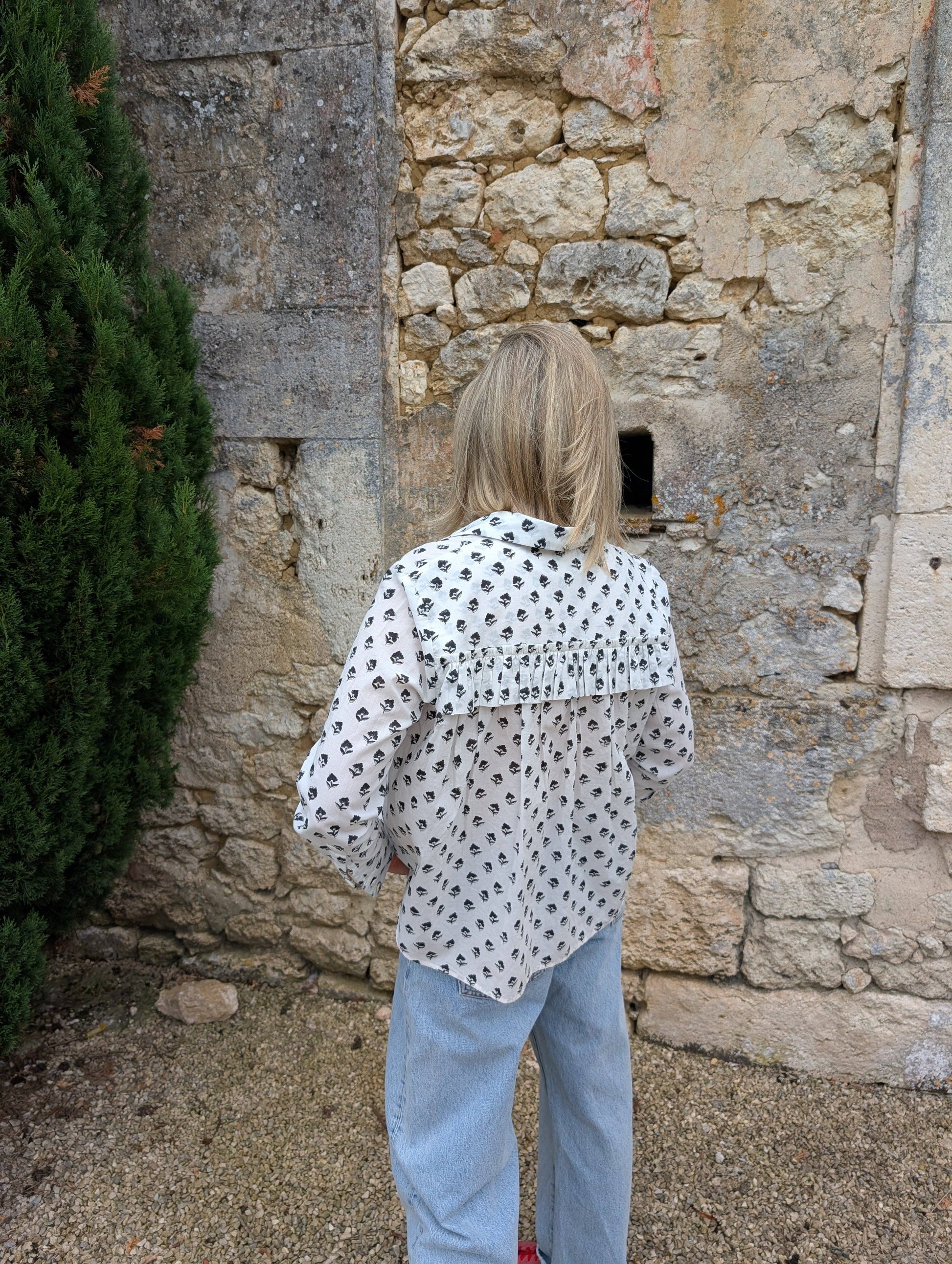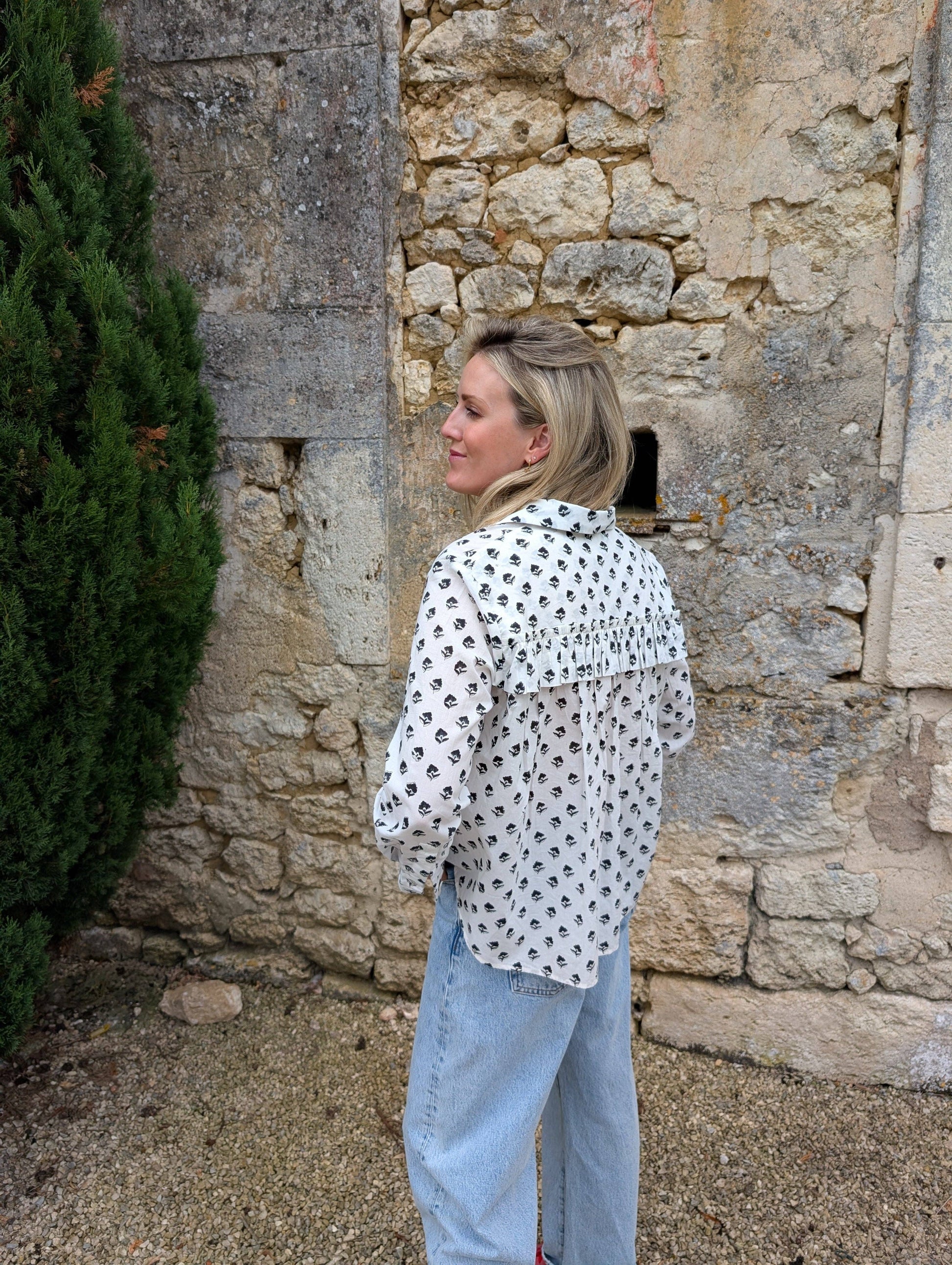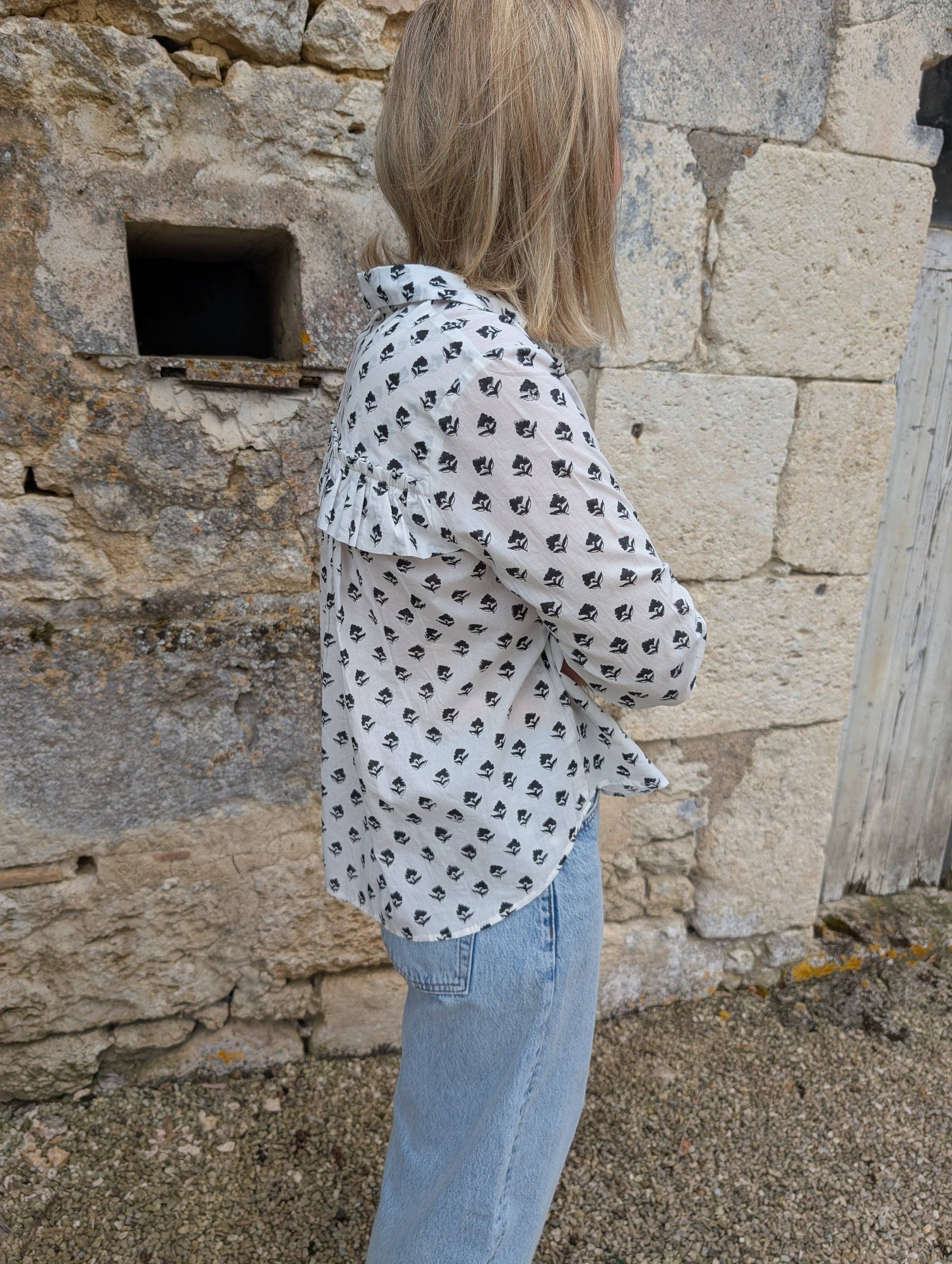 Add some playful flair to your wardrobe with our Darana Black ruffle shirt. Made in India, this unique shirt features a block print of black flowers and a stylish ruffle back.