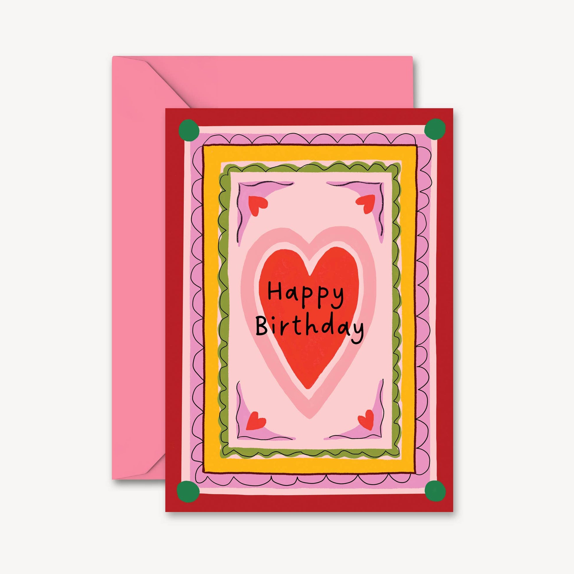 Say "Happy Birthday" with this cute and colourful card, featuring a retro-inspired heart design and a bold, patterned border. Perfect for celebrating the birthdays of your friends, mum, grandmother, sister, aunt, or anyone you want to say happy birthday to with a fun, joyful design. Designed to stand out on the shelf and bring a smile to their face.