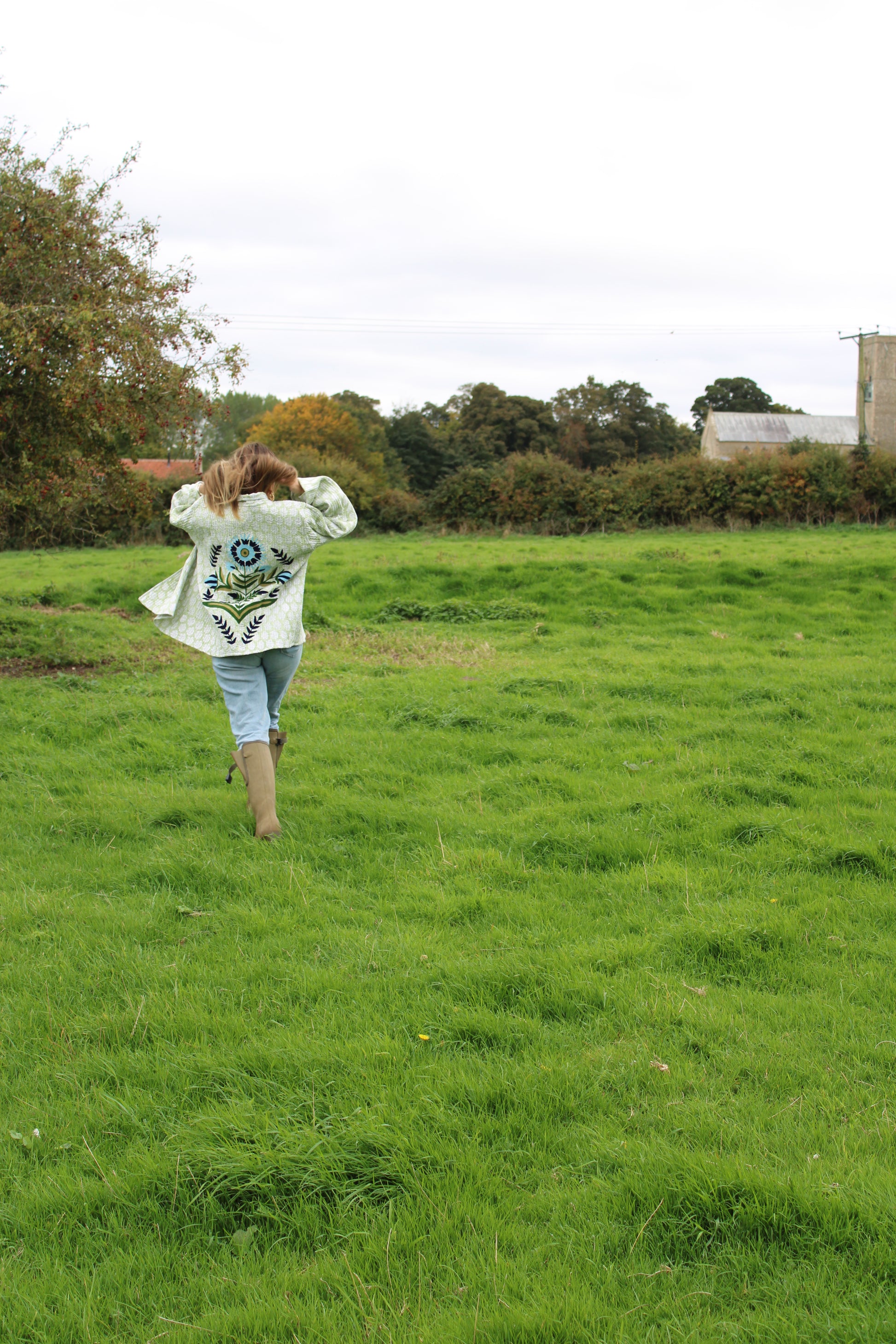 Block printed freesize green and white block printed quilted jacket in the softest cotton, so versatile with a long sleeve and open front. Stunning embroidery detail on the back. Perfect with a pair of jeans and trainers (or wellies!) to dress it up worn over a white t-shirt or a knitted jumper or cardigan. The ultimate layering piece