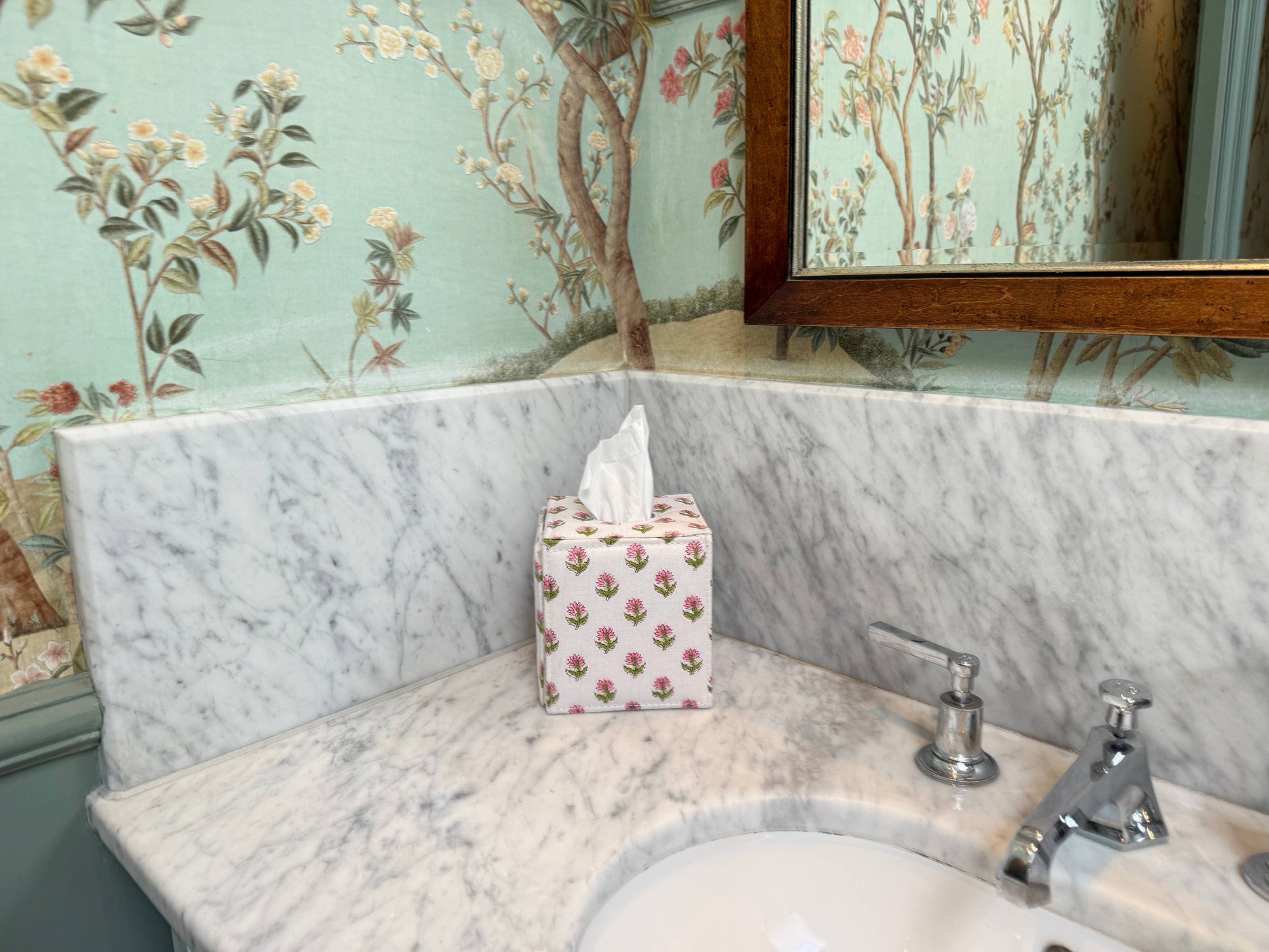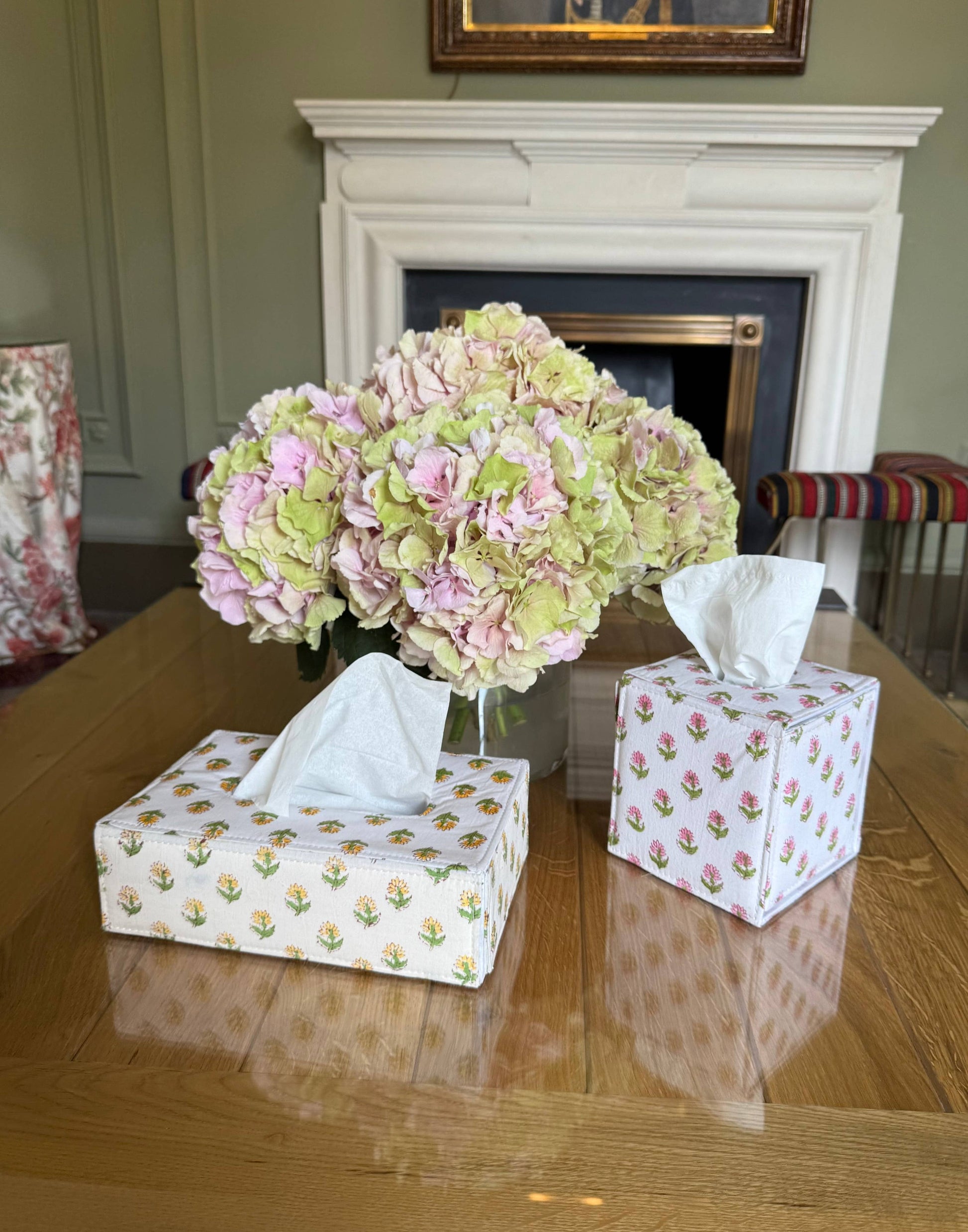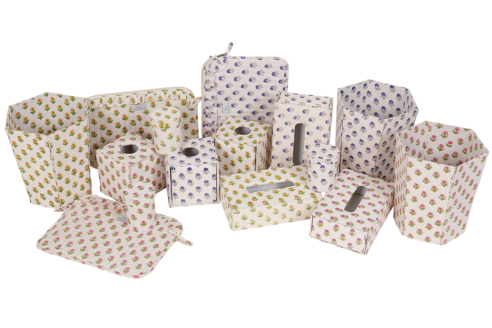 Hand Block Printed Fabric Wate Paper Bins and Tissue Box Covers. Perfect for the Bathroom, Bedroom or Dressing Room.
